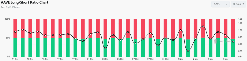 According to data from CoinGlass, AAVE’s Taker Buy/Sell Volume over the past month shows that buyer dominance has been rare. This indicates that bulls have struggled to overcome persistent selling activity.
