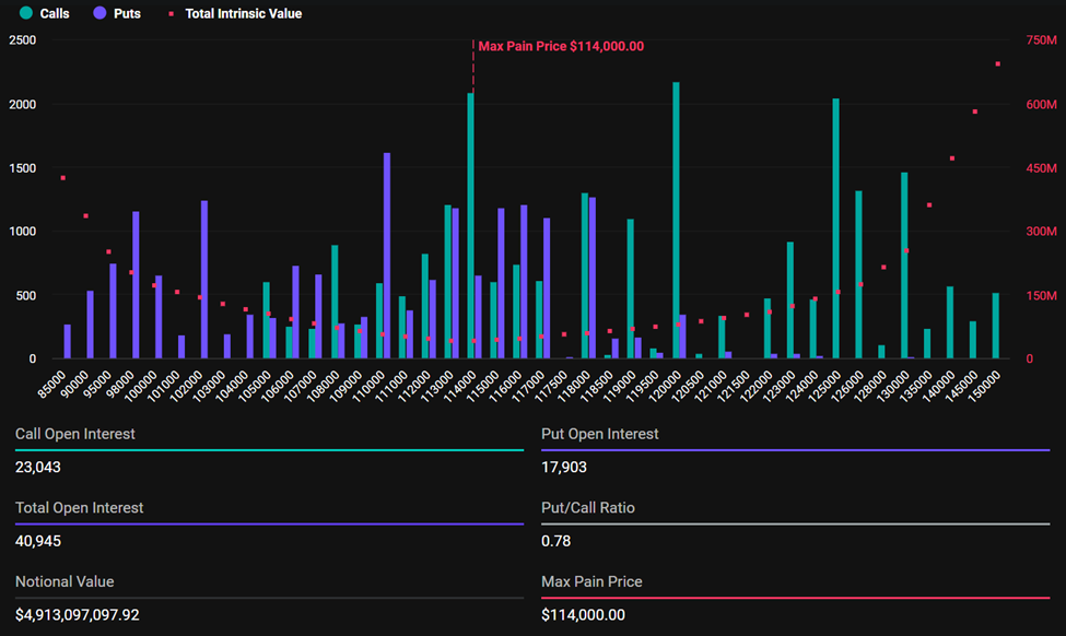 Today marks the expiry of over $5.76 billion worth of Bitcoin and Ethereum options, potentially shaking up price dynamics as traders adjust positions. Data from derivatives exchange Deribit reveals Bitcoin’s open interest at 40,945 contracts, valued at around $4.91 billion. The so-called max pain price for BTC options stands at $114,000, notably below Bitcoin’s current trading price of $120,259.
