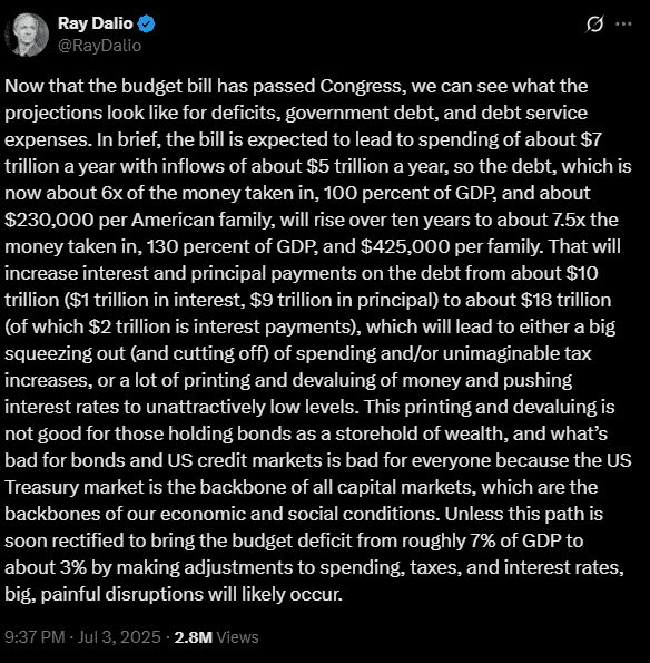 Ray Dalio, founder of Bridgewater Associates, voiced stark warnings, suggesting that if the bill moves forward in its current form, the average American household may face an unsustainable debt burden within the next ten years. According to Dalio, this could prompt drastic measures such as increased taxation, reduced government spending, or extensive money printing—each of which may diminish the purchasing power of the U.S. dollar.