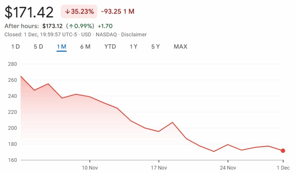 The slowdown in inflows was accompanied by a sharp correction in DAT equities. Major DAT stocks underperformed throughout November, despite a brief rally on the first Monday of the month. Strategy, the sector’s largest DAT, fell 35.23% over the month, dropping from $264.67 on November 3 to $171.42 at the time of reporting.