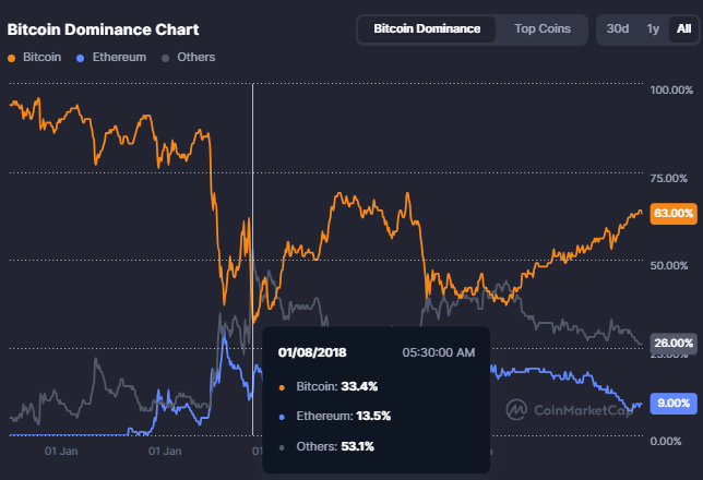 Currently, Bitcoin holds 63.9% of total market share, growing 0.13% daily. Ethereum trails with 9.6%, and other altcoins make up the remaining 26.5% (a slight drop of 0.36%). Historical data shows Bitcoin once reached 87.4% dominance back in 2013 — a time before Ethereum and the altcoin boom. The landscape has since evolved, but Bitcoin’s strength is clearly resurging.