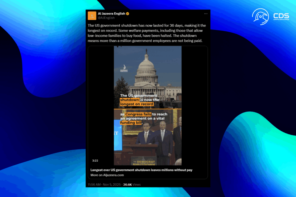 Bitcoin has passed the $100,000 crash test despite a concerning decline on Friday. The focus now shifts to Washington. Financial markets and, consequently, cryptocurrency have lost liquidity due to the longest government shutdown in US history. The same dynamic that drew liquidity out will bring it back in once the fiscal impasse is resolved, according to analysts, paving the way for a comeback.