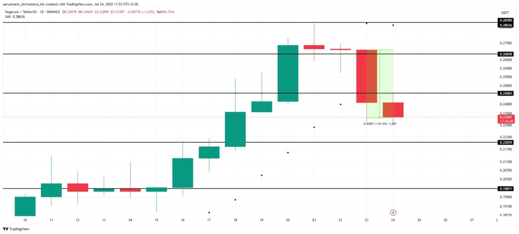 Currently, Dogecoin trades around $0.233, below the important resistance level at $0.245. If selling persists, the price could break below the $0.220 support, possibly testing $0.198 in the near future. This scenario points to a prolonged bearish trend as profit-taking dominates.