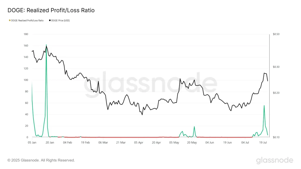 After last week’s impressive price surge, many DOGE investors decided to sell, pushing the realized profit/loss ratio to its highest level in six months. These profit-takers seem skeptical about further upside, triggering a sharp drop from recent highs. The wave of selling pressure has led to a bearish reversal in Dogecoin’s price momentum, putting the coin under notable strain.
