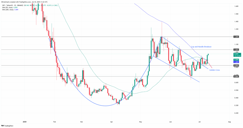 Chart data reveals that Dogwifhat (WIF) has broken out from a classic cup-and-handle formation, a bullish technical pattern that often precedes sharp upward moves. Adding to this strength is a golden cross between the 50-day and 200-day simple moving averages, which signals a potential long-term shift in trend.