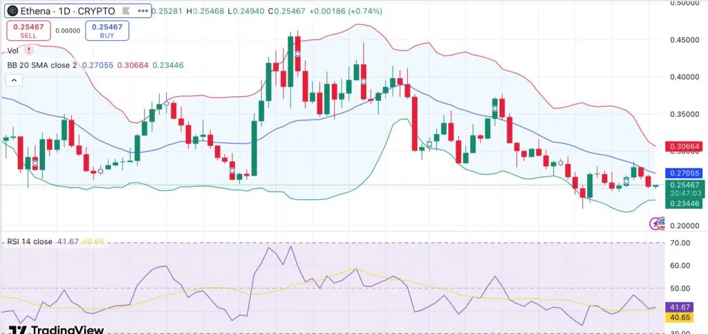 Ethena (ENA) continues to struggle below key moving averages, from the 10-day to the 200-day, all signaling weakness. The token is trading below both its 20-day EMA and SMA. The RSI sits at 41.4, nearing oversold territory, but still within neutral range. Bollinger Bands are narrowing, suggesting low volatility, with price hovering near the lower band.