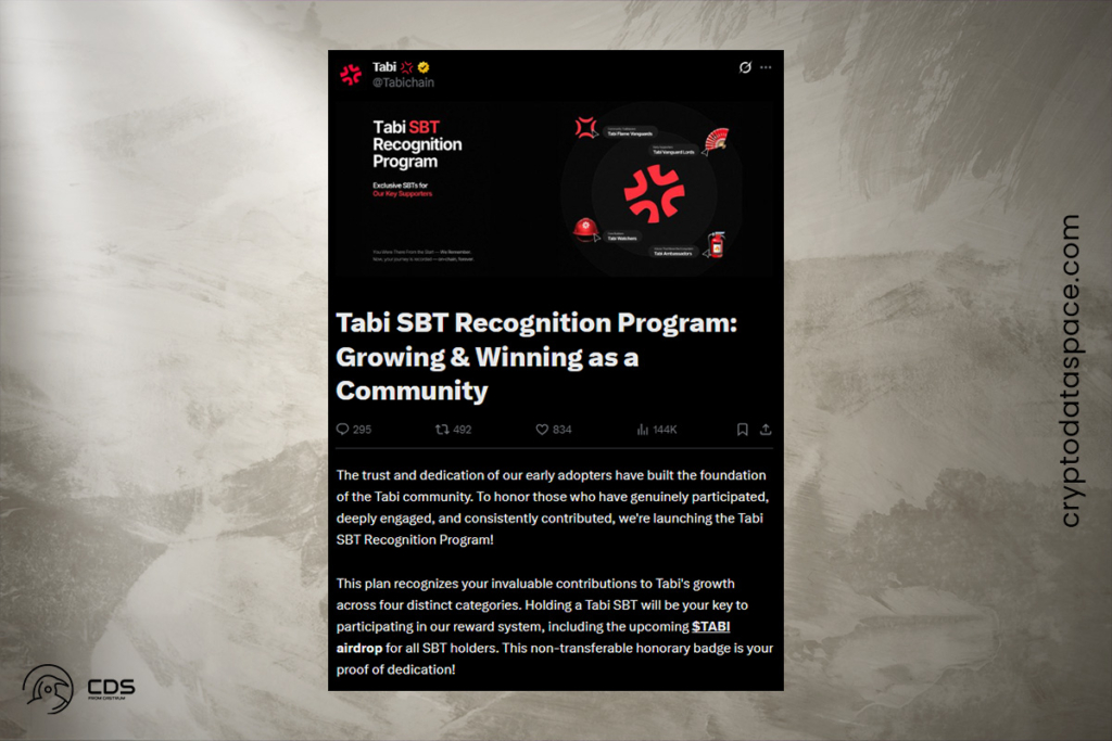Earlier this month, Tabi introduced a brand-new initiative known as the SBT Recognition Program. It gives airdrop farmers the opportunity to provide project-related material and receive SBTs. Interestingly, the SBTs are honorary badges that are non-transferable and serve as proof of genuineness and service to Tabi.