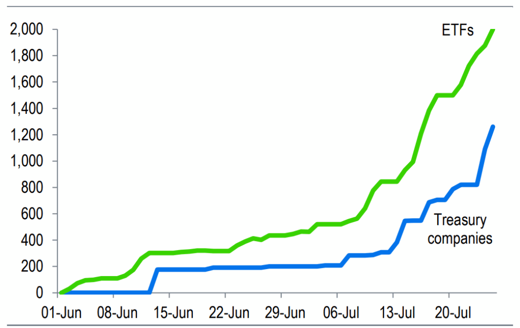 ETH ETFs– A new wave of corporate treasuries is reshaping the crypto landscape, bridging the gap between traditional finance and digital assets. Companies like Strategy, Metaplanet, and SharpLink have collectively accumulated nearly $100 billion in cryptocurrencies, according to a new report from Galaxy Research.