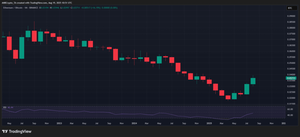 ETH/BTC has posted two consecutive green months for the first time since 2022—up more than 70% since May. The data suggests Ethereum is now the preferred asset in a risk-on market.
