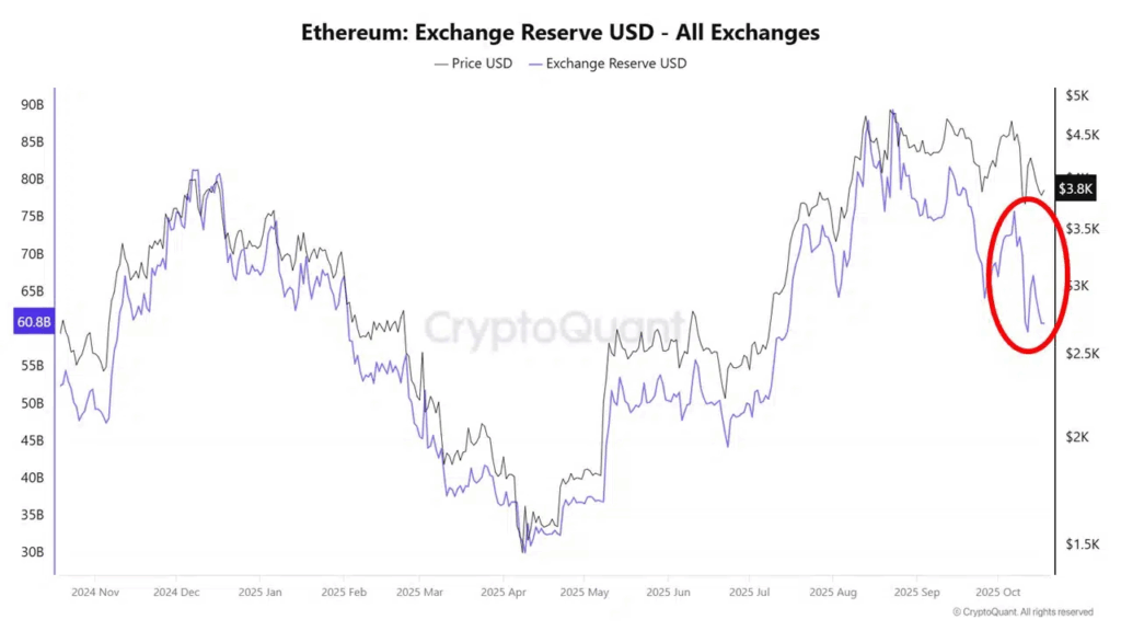Ethereum’s exchange reserves have dropped to new yearly lows, reducing the amount of ETH readily available for sale. This suggests that holders are increasingly moving coins off exchanges, potentially into cold storage — a pattern often associated with long-term accumulation.