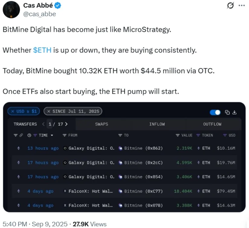 Institutional adoption continues to play a significant role in driving Ethereum’s demand. BitMine Digital, often referred to as the “MicroStrategy of Ethereum,” recently executed a sizable $44.5 million over-the-counter purchase of 10,320 ETH. This acquisition increased BitMine’s holdings to over 2 million ETH, valued at nearly $8.9 billion. Market observers compare this consistent treasury accumulation to Michael Saylor’s approach with Bitcoin, lending further credibility and confidence to Ethereum’s long-term prospects.