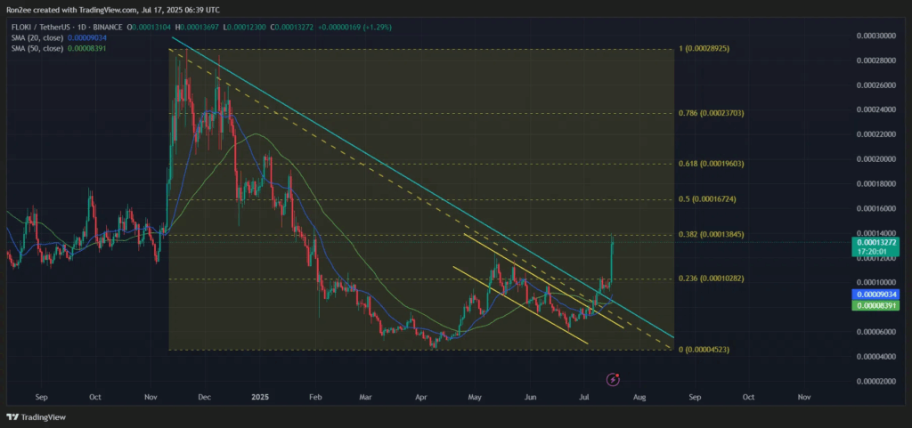 The recent rally kicked off when FLOKI decisively broke out of a long-term descending trendline and completed a successful retest on the daily chart. After being trapped in a downtrend since late 2023, characterized by lower highs and lows, FLOKI started showing signs of strength in mid-May by forming higher lows—hinting that buyers were returning.