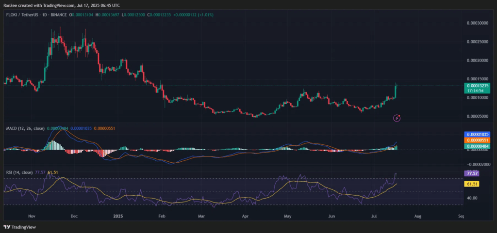FLOKI Rally– FLOKI surged an impressive 40% to hit $0.000138 on July 17, marking its highest level in six months. Though it slightly pulled back to $0.000129, the token remains up 175% since its April lows, signaling strong bullish momentum.