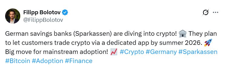 German Banks Catch Up – Germany’s Sparkassen-Finanzgruppe, one of the country’s largest financial institutions, is taking a historic step toward crypto adoption. With over 50 million customers, the banking giant plans to launch crypto trading services via the Sparkasse mobile app by summer 2026. The initiative will be powered by Dekabank, a group subsidiary already involved in crypto services.