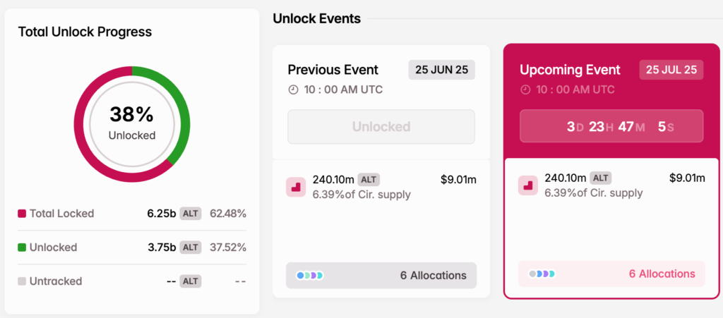 Also on July 25, AltLayer will release 240.10 million ALT tokens, about 2.4% of its total supply of 10 billion and 6.39% of the circulating supply. This unlock is valued near $9.01 million. Tokens will be distributed among investors, the treasury, development teams, advisors, and the wider ecosystem. AltLayer is a decentralized protocol focused on scalable and customizable rollups, often described as “rollup-as-a-service” (RaaS).