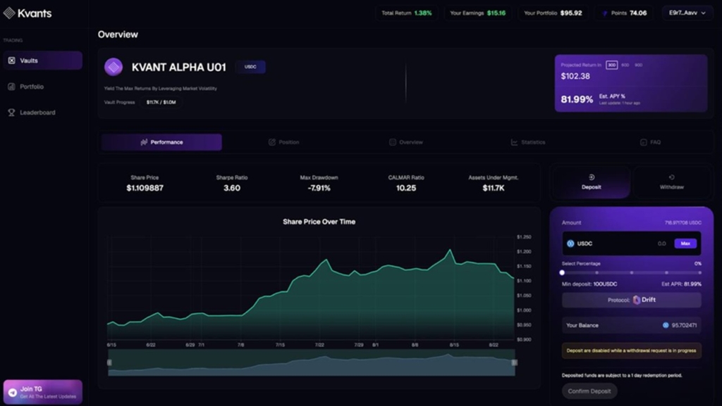 The core purpose of Kvants Vaults is to offer investors a reliable diversification tool that balances performance with protection. Unlike speculative strategies or passive holding, Vaults are structured to reduce drawdowns while still participating in market upside. For example, during a recent downturn, Bitcoin declined nearly 10%, while Kvants Vaults limited losses to just about 1%. This downside protection enables investors to remain exposed to digital assets without being subjected to the full volatility of the market.