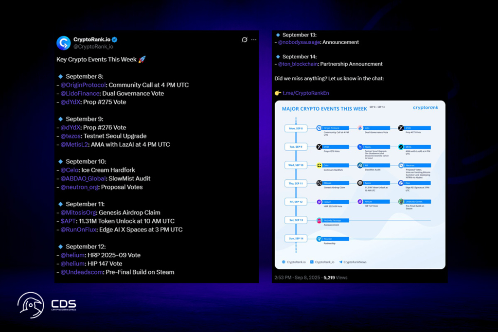 Numerous milestones pertaining to governance are occurring in prominent initiatives. Lido Finance is wrapping up crucial votes on its validator migration and Dual Governance upgrade, and dYdX is finishing up its Prop #275 on changes to the VIP Affiliate Program. The EigenDA v2 update will be introduced on September 10 during Celo’s eagerly awaited “Ice Cream Hardfork,” which promises quicker confirmations and better data availability, while Tezos is getting ready for its “Testnet Seoul Upgrade.” To indicate possible improvements for its ecosystem players, Helium will vote on Improvement Proposal #147 and reward modifications in the meantime.