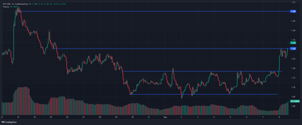 SPX’s breakout above the $1.30 resistance—previously a strong rejection zone—was driven by a high-volume rally that formed a price gap. At press time, SPX hovered around $1.34, with daily volume exceeding $42 million.