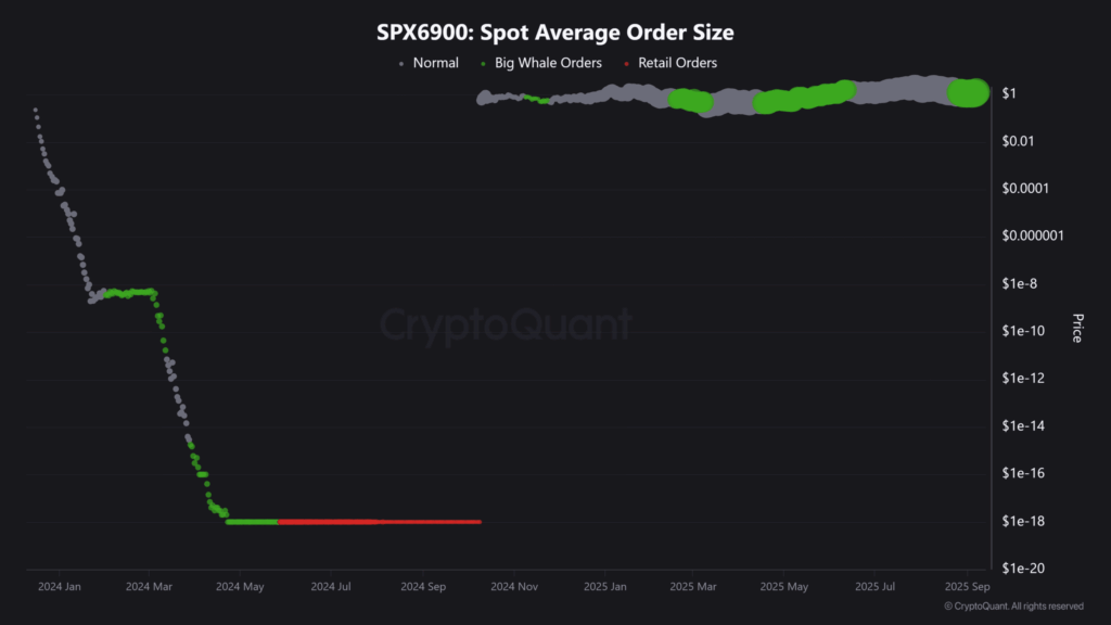 On-chain metrics from CryptoQuant show a rise in Spot Average Order Size, highlighting large players as the primary market movers. SPX has consistently attracted whale interest since holding above the $1 mark.