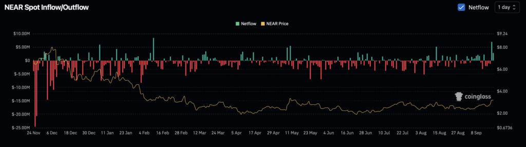 Despite strong fundamentals, short-term price pressure is emerging from spot markets. Over the past 48 hours, approximately $9.64 million worth of NEAR has been sold across exchanges.