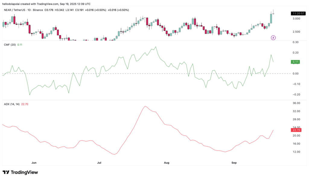 Momentum indicators support the bullish on-chain narrative. The Chaikin Money Flow (CMF) rose to 0.26, reflecting increasing capital inflow and strong buying pressure. Similarly, the Average Directional Index (ADX) has been trending upward, reinforcing the strength of the current rally.