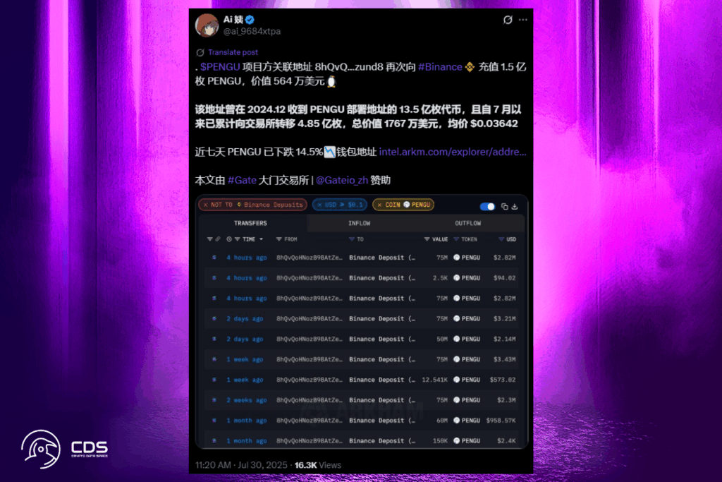 According to an anonymous analyst Ai’s on-chain data, on July 30th, address 8hQvQ…zund8, which is linked to the PENGU deployment wallet, sent 150 million tokens—roughly $5.64 million—to Binance. Since early July, the address has shifted 485 million PENGU, or almost $17.67 million. Prior to this, more transfers were noted.