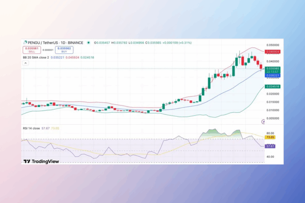 At $0.0352, PENGU is holding close to its 20-day simple moving average. It is currently closer to the $0.0245 lower band support after recently retreating from the upper Bollinger Band. The relative strength index has now fallen to 57.6 after hitting overbought levels above 73 earlier this week.
