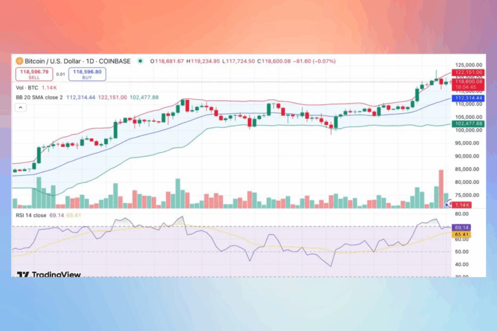Technically, BTC is consolidating at a level slightly below the upper Bollinger Band, which is approximately $122,151. A relative strength index of 69 indicates strong but not overheated momentum, just below the overbought threshold. Momentum and MACD indicators, among other oscillators, continue to suggest a bullish bias. The idea that Bitcoin is still in a firmly bullish situation is supported by the upward-advancing moving averages from the 10-day to 200-day periods.