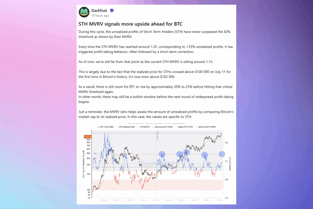 At present, that figure is around 1.15. To put it simply, short-term holders are not currently sitting on the kind of profits that have previously led to significant sell-offs. This allows Bitcoin to rise another 20% to 25% before reaching that well-known tipping point. The realized price, or the average price paid by short-term holders, just surpassed $100,000 for the first time, which is largely responsible for this change.