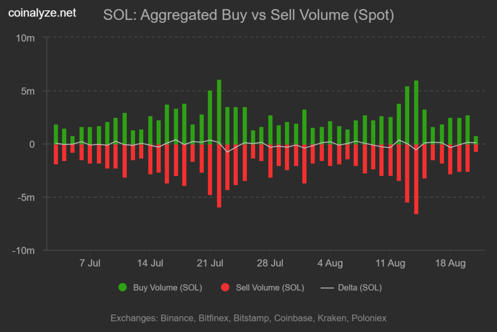 Data from Coinalyze shows Solana’s buy volume slightly outpaced sell volume, with $3.4 million in buys versus $3.2 million in sells, indicating renewed demand.