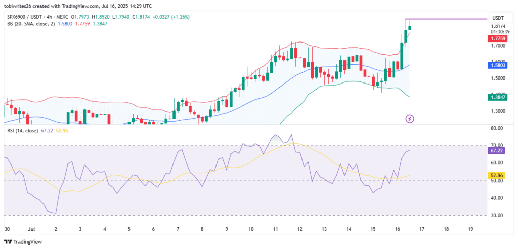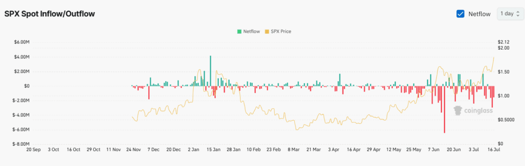 SPX’s new all-time high comes amid significant buying activity. In the last 24 hours alone, investors snapped up $1.47 million worth of tokens. More strikingly, from July 13-15, total accumulation across exchanges reached nearly $5 million (Spot Netflow data, CoinGlass).