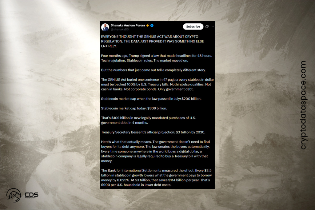 The government doesn’t need to find buyers for its debt anymore. The law creates the buyers automatically. Every time someone anywhere in the world buys a digital dollar, a stablecoin company is legally required to buy a Treasury bill with that money.
