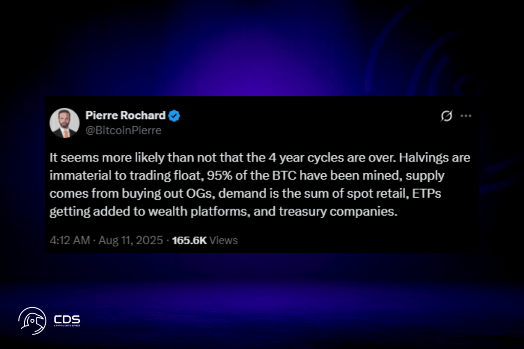 The conventional four-year halving cycle of Bitcoin may be losing its dominance as a market mover, according to several prominent figures in the cryptocurrency space. Since 95% of Bitcoin has already been mined, Pierre Rochard, CEO of The Bitcoin Bond Company, contends that halvings are now immaterial to market dynamics.