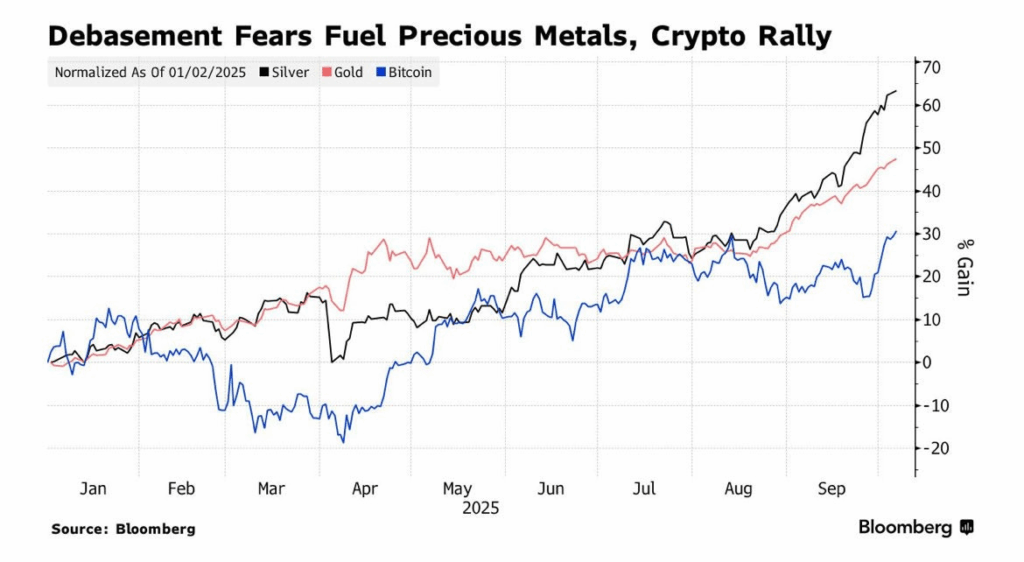 The debasement trade refers to an investment strategy focused on safeguarding value as fiat currencies lose purchasing power due to monetary expansion and central bank money printing. Investors look to assets believed to retain or grow in value despite currency debasement. Gold, for instance, has increased by 50% this year, while Bitcoin has also drawn significant interest.