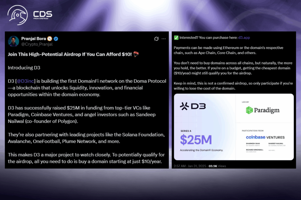 The $25 million that was raised in January will help with some of the cash. Users who mint domains in four networks—ApeChain, Core, Shiba, and Viction—are rewarded by the initiative. Notably, this activity requires some financial investment from airdrop growers. However, doing so gives participants a spot among the early users, which could make them eligible for more project airdrops in the future. In addition to minting domains, which have no deadline, D3 is also operating the Doma testnet, which started on June 24, and a Nods role, which began on July 2.