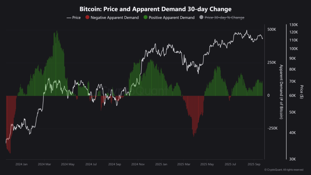 Despite recent pullbacks, demand from ETFs and crypto treasuries has stayed steady after a September surge. If institutional appetite picks up again in Q4, BTC could see renewed strength. However, any slowdown, similar to Q1 trends, might weigh on prices.