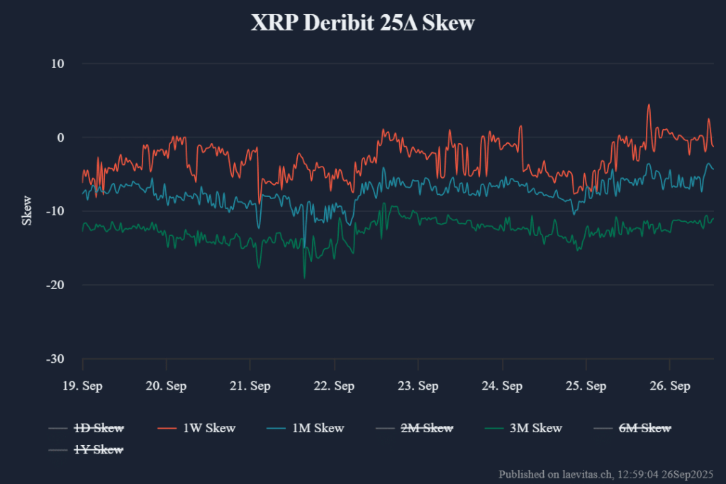 While BTC showed resilience, XRP sentiment remained flat to negative across all tenors. Analysts warn that if Bitcoin continues to gain market share, altcoin momentum could stall further—posing a challenge for traders eyeing potential altcoin ETF approvals in October.