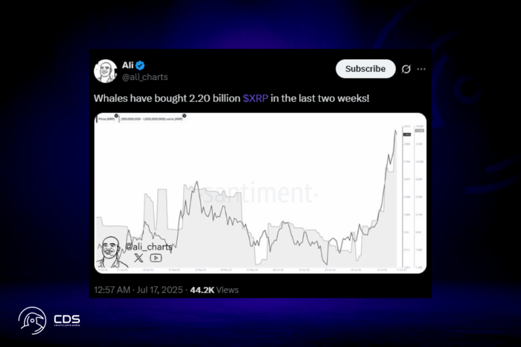 In the past two weeks, whales have bought 2.2 billion XRP, according to prominent analyst Ali Martinez. At current pricing, this hoard is worth well over $6.6 billion in US dollars. XRP increased steadily over time, surpassing $3. Growing investor interest in the asset seems to be correlated with the substantial rise in buying pressure.