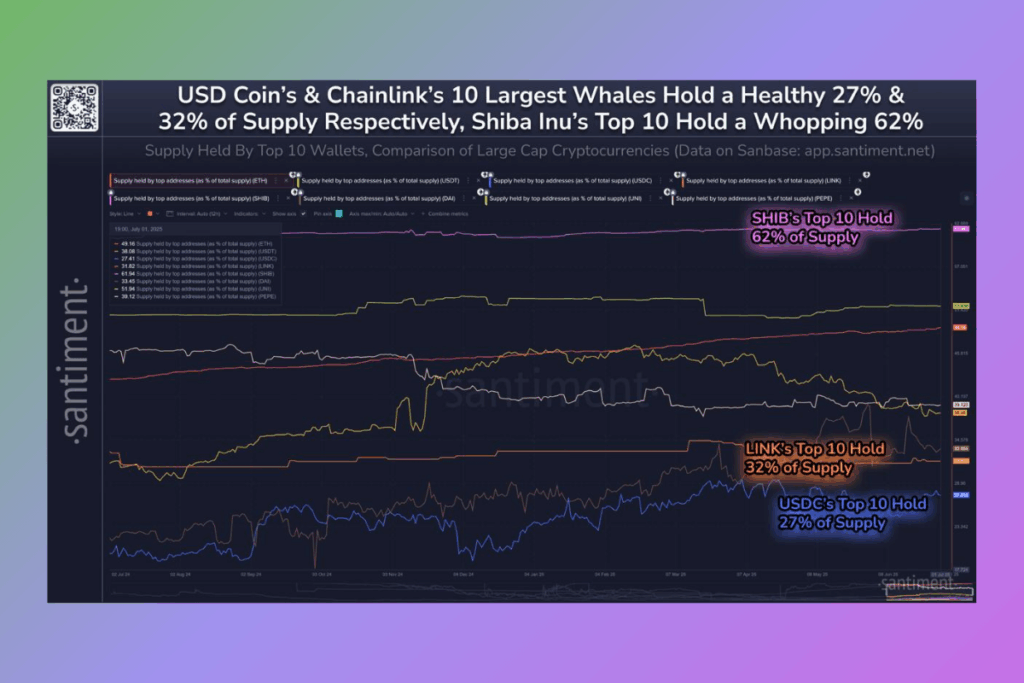 Important insights for traders keeping an eye on whale influence are revealed by new data from Santiment that reveals significant variations in token distribution among the leading cryptocurrencies. The platform revealed considerable differences in the degree of decentralization between the supply owned by the top 10 largest wallets for different large-cap assets.