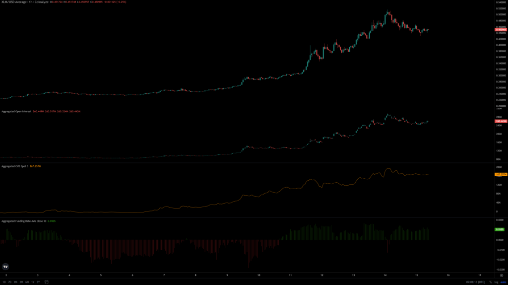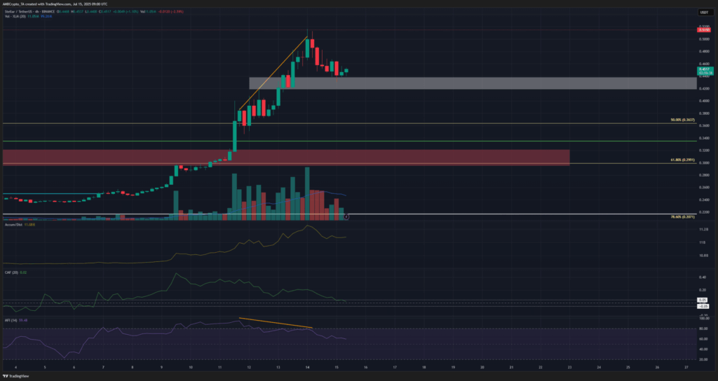 XLM’s recent price dip coincided with a 4.95% pullback in Bitcoin (BTC), which dropped from $123.2k to $117.1k. According to Coinalyze data, despite the pullback, bullish enthusiasm remains intact in the short term, supported by positive funding rates. The 10.6% drop in XLM’s price was accompanied by a $20 million decline in open interest, suggesting profit-taking and long liquidations near the $0.51 resistance zone.