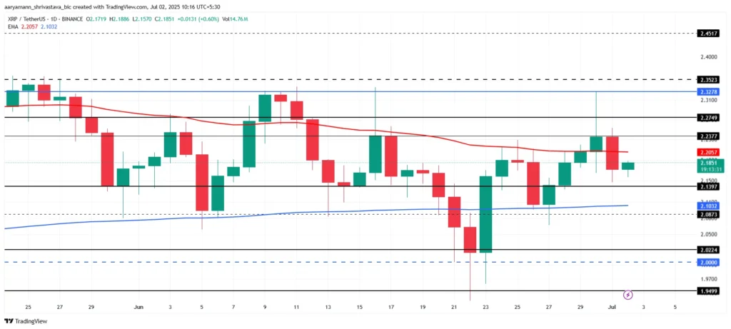 During June, XRP consistently traded below the pivotal $2.32 resistance level—never breaking above it. The 50‑day Exponential Moving Average (EMA) acted as temporary support only twice, but failed to spark sustained bullish movement. Persistent buying‑selling rotations kept XRP confined to a tight, choppy range.