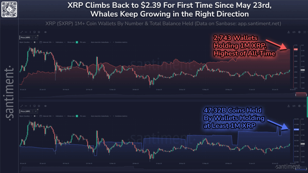 XRP has climbed nearly 12% over the past week and is currently trading around $2.43—just shy of the key resistance level at $2.45. This zone has historically served as a barrier to further gains. However, with increasing retail participation and steadfast whale support, XRP appears poised to test this level again.