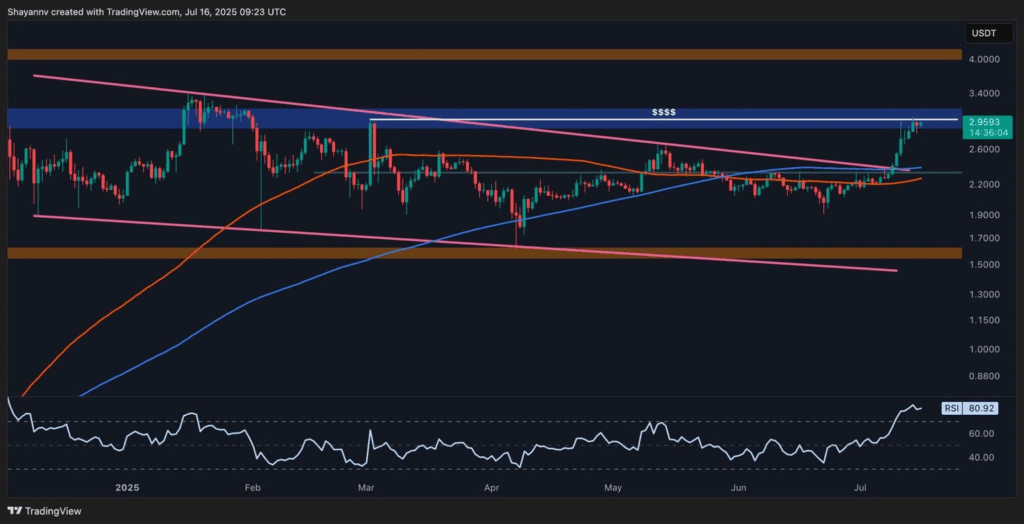 Now eyeing the $3.00 psychological resistance, XRP faces its first real test. The Relative Strength Index (RSI) is hovering around 80 — an overbought level that historically leads to short-term cooling. Still, if the price can hold above $2.30, bulls may target $3.40 and even $4.00 in the weeks ahead. A drop below $2.00, however, could shift sentiment back to caution.