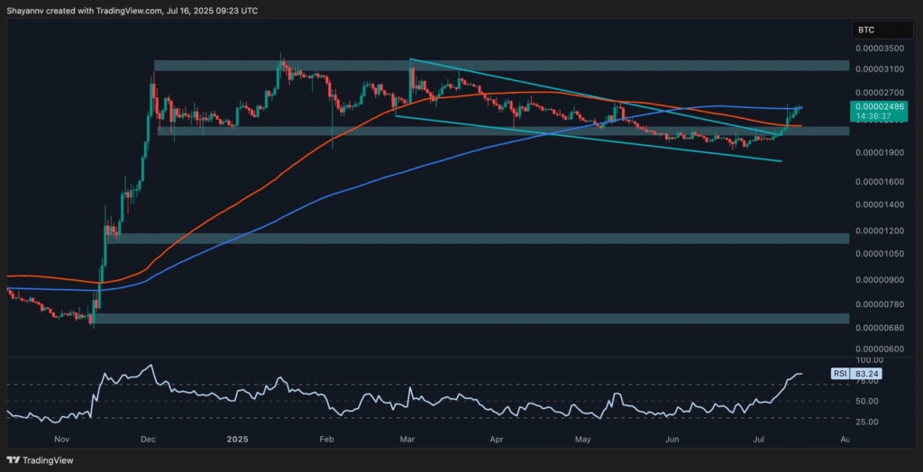 XRP has also awakened against Bitcoin, breaking out of its own falling wedge and flipping the 2,200 SAT level into support. Currently trading near 2,500 SAT, XRP/BTC is testing its 200-day moving average — a key technical milestone not reached for much of 2025.
