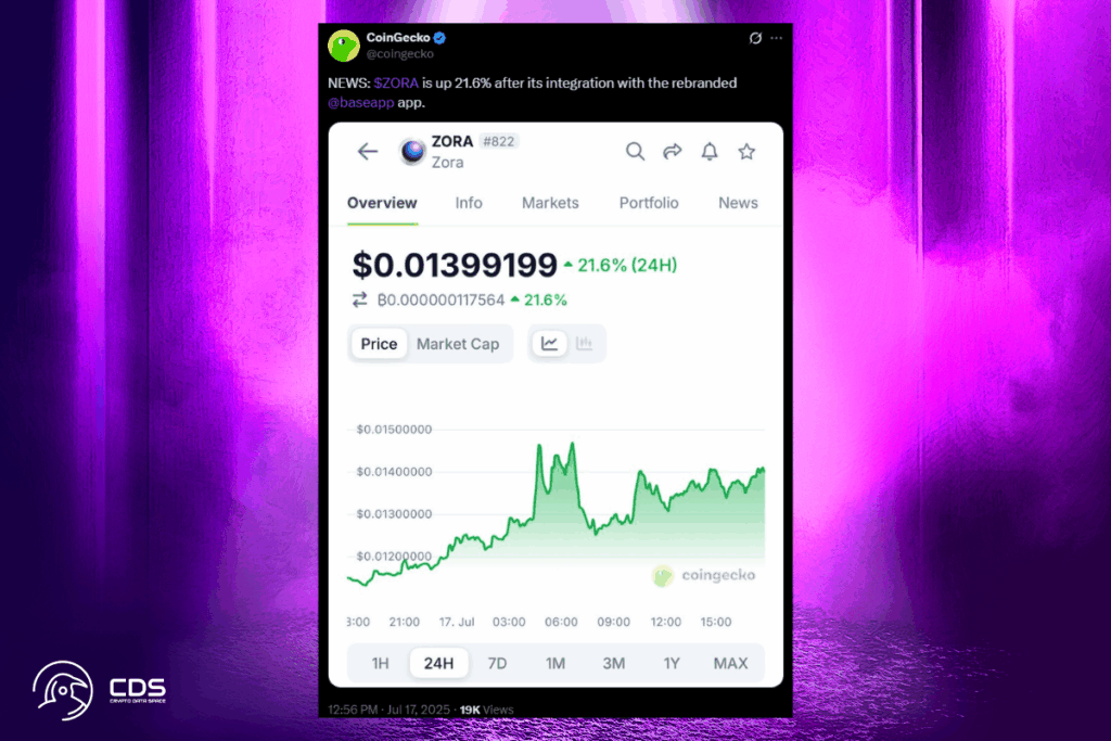 However, following its integration with the Base App, the coin regained momentum in mid-July. Coinbase revamped its wallet and released the app on July 17. The infrastructure of Zora and Farcaster is used by this app. Users can trade and tokenize stuff with it. In order to mint content coins, pay referral fees, and take advantage of ecosystem incentives, the ZORA token is essential. In this regard, a rally was sparked by this integration and was subsequently strengthened by additional triggers.